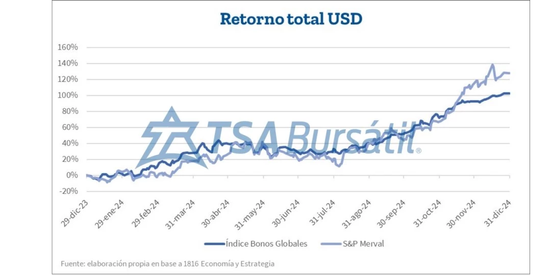 Además, los avances conseguidos en materia económica, sumados a las perspectivas para el 2025 ayudaron a que los activos locales se destaquen. Por su parte, los bonos soberanos en dólares acompañaron el movimiento alcista, con una curva de rendimientos que terminó prácticamente plana en torno a 11%. Esto se tradujo en una reducción del riesgo país desde los 1.900 pbs que mostraba al inicio de año, hasta los 640 pbs de fines de diciembre.
