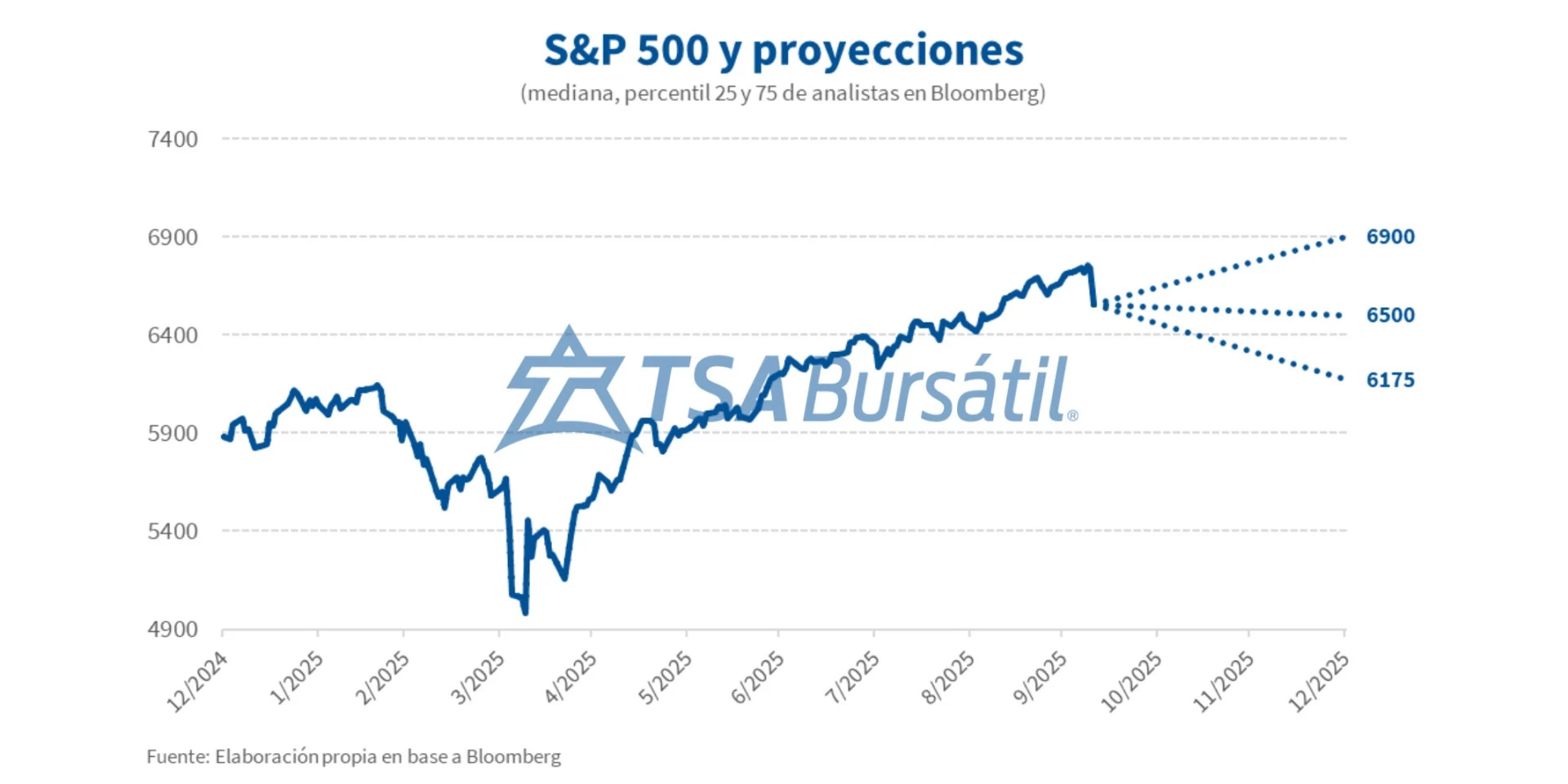 A nivel de recomendaciones, desde FactSet señalan que el 56% de las calificaciones para empresas del S&P 500 son de “compra”, 38,7% de “mantener” y 5,3% de “venta”. A pesar de esto, cuando se analizan los precios objetivos para el índice hacia fines de 2025, los números dejan algo de espacio alza, aunque sólo para los más optimistas. Considerando el precio de cierre del viernes (6.552,51), el mismo prácticamente iguala a la mediana de las proyecciones en Bloomberg (6.500). Cuando se analizan el percentil 25 y 75, la caída o suba podrían alcanzar -5,8% y +5,3%, respectivamente.