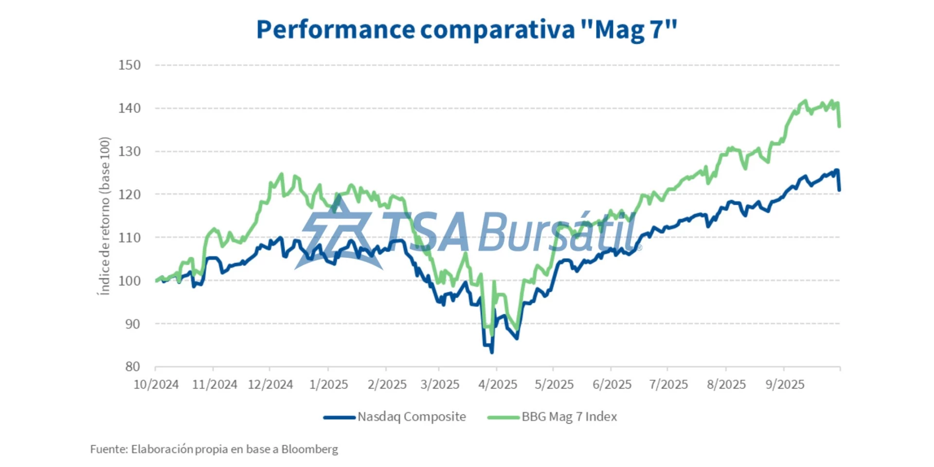 De esta forma, el índice compuesto por estas 7 acciones elaborado por Bloomberg (BM7P) avanzó +13,6% desde el 30 de junio hasta el viernes pasado, mientras que referencias como el Nasdaq Composite y el S&P 500 hicieron lo propio con subas de +9,0% y +5,6%, respectivamente.