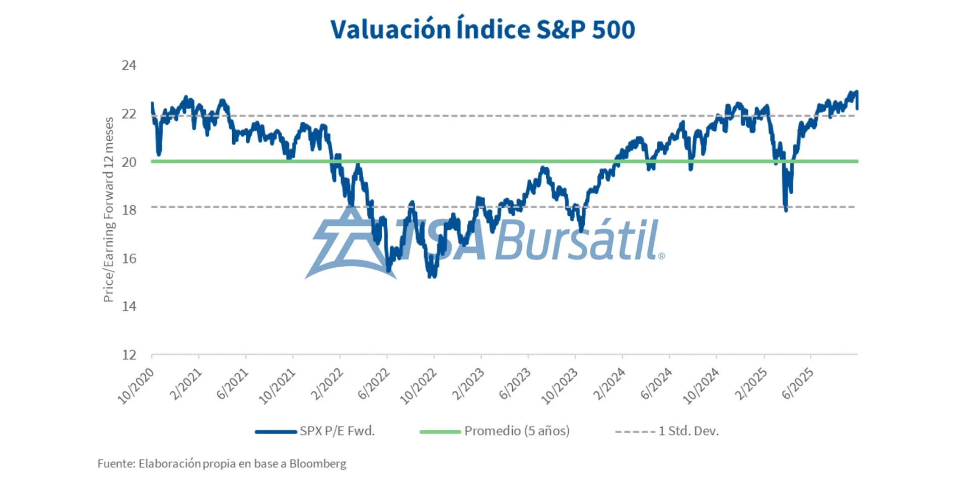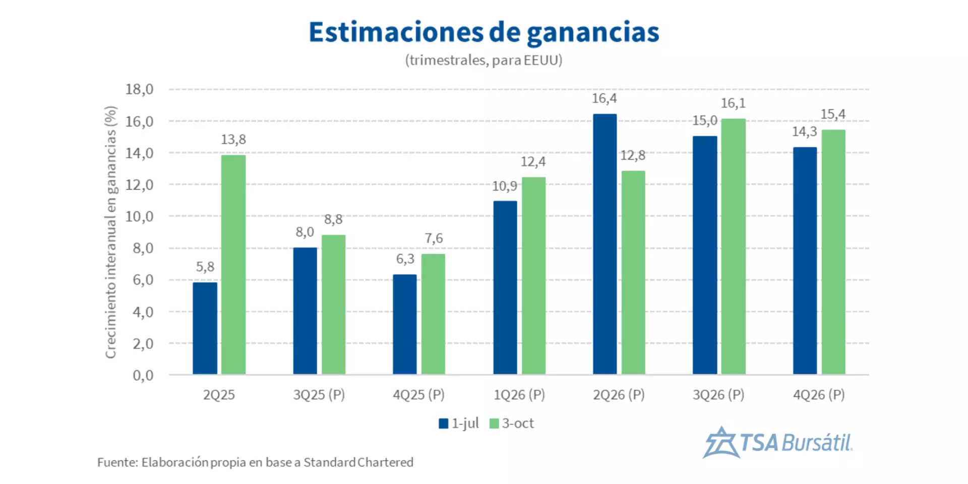 En Standard Chartered se suman a la narrativa de que una fuerte temporada de balances, impulsada por la IA y el sector tecnológico, puedan contrarrestar los vientos de frente de corto plazo. Destacan que en base a cifras de LSEG I/B/E/S, el crecimiento en ganancias desaceleraría desde el 2T25 (+13,8% a/a) al 3T25 (+8,8% a/a) y al 4T25 (+7,6% a/a). Sin embargo, para el año 2025 las proyecciones apuntan a +10,8% (desde +8,5% a mitad de año), con 2026 cerrando en +14%, reflejando el optimismo entre analistas respecto al estado de los balances corporativos.